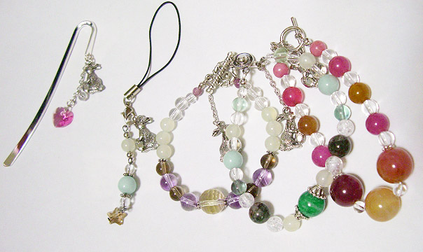 天然石+うさぎチャームブレス、スワロフスキースタービーズ+うさぎチャームストラップ、スワロフスキーハートビーズ+うさぎチャームブックマーク。