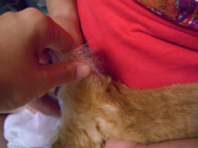 今回は、姫ちゃんのお尻にビットリと盲腸糞の一部がこびり付いて排泄部分を塞いでいた。