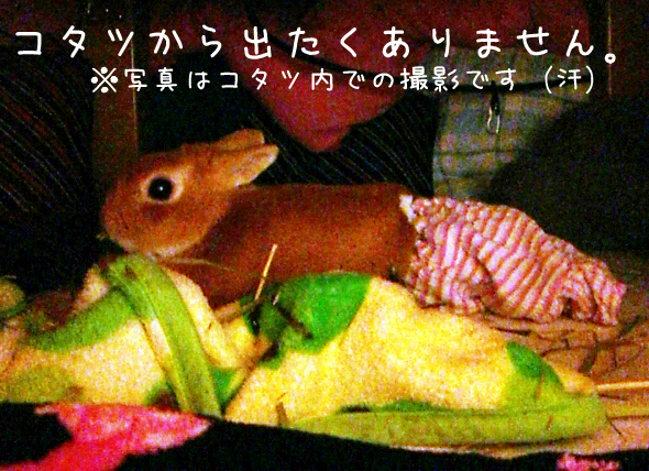 で、私が人間の晩御飯を作ってる間、ずーっとコタツで寝転んだり牧草を食んだりして寛いでる。